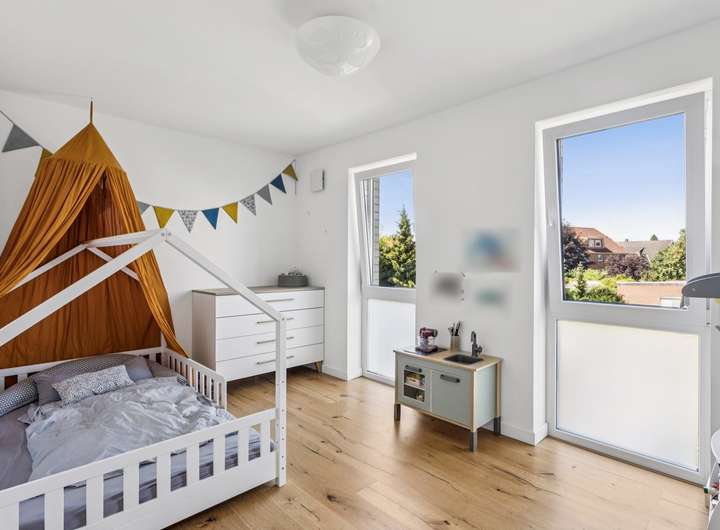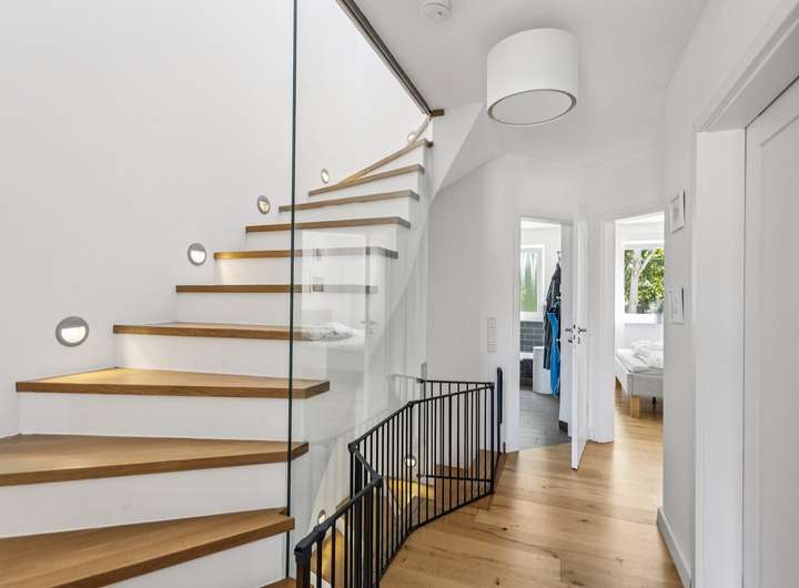 Über eine mit geölten Eichendielen belegte Treppe gelangen Sie in das erste Obergeschoss. Ein besonderes Highlight ist die große Glasscheibe aus Verbundsicherheitsglas, die den offenen Treppenbereich stilvoll ergänzt. Hier befinden sich zwei geräumige Schlafzimmer, ein Tageslichtbad mit Wanne und Dusche sowie ein Hauswirtschaftsraum mit Technikzentrale.