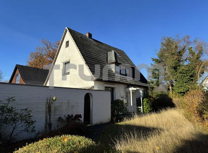„Gehobene Lage“ nach Süden – Das Grundstück fällt nach Süden hin erst auf dem letzten Meter um ca. 1 m ab, was den Eindruck entstehen lässt, man schaue über die Dächer in Richtung Alstertal hinweg. Baulich ergeben sich dadurch interessante Möglichkeiten, z. B. die Ausgestaltung eines unteren Gartengeschosses nach Osten.