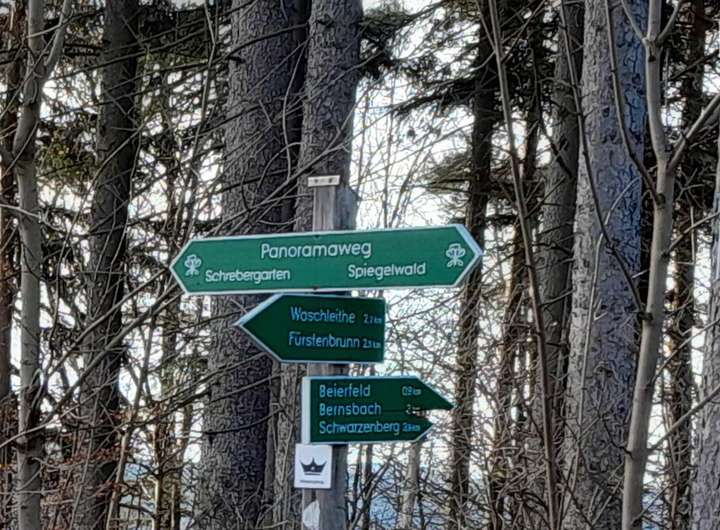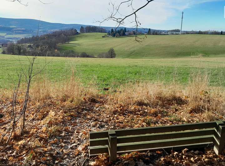 Ein Wanderweg liegt direkt vorm Grundstück und führt am Waldrand entlang mit Panoramablick ins Erzgebirge.