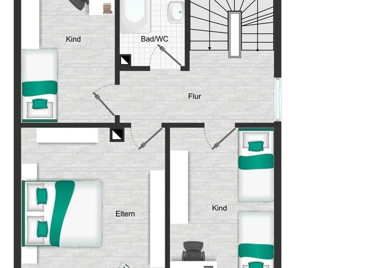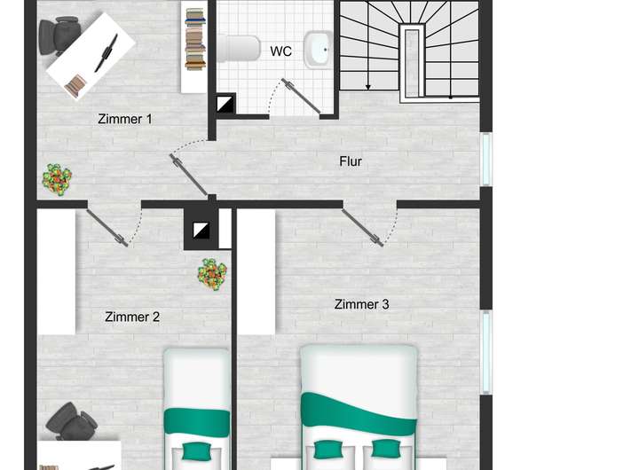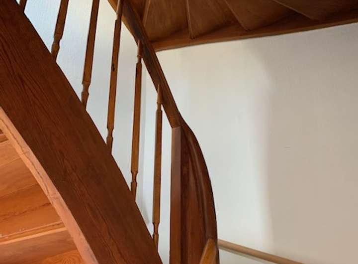 Von hier gelangen Sie über eine Holztreppe in die beiden oberen Geschosse, in denen sich 5 Zimmer, ein Bad und ein WC befinden.