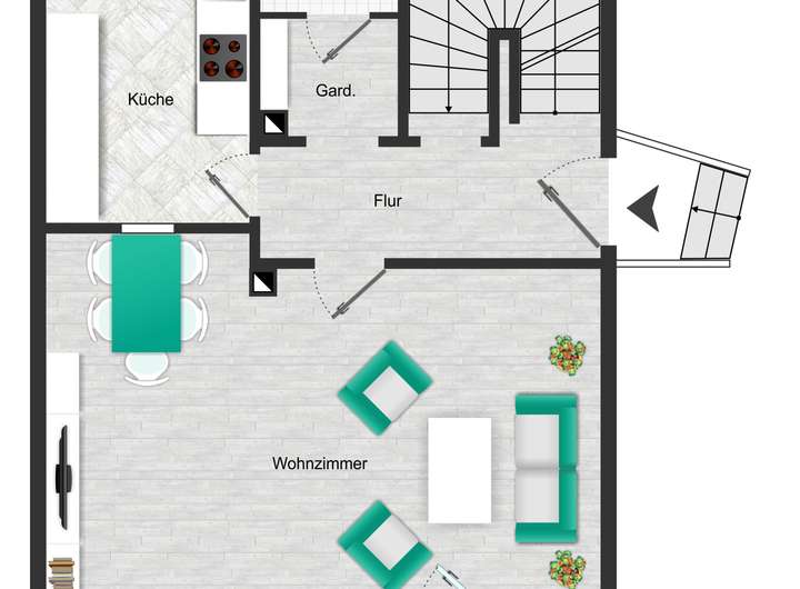 Ergänzt wird die Wohnebene im Erdgeschoss durch ein Gäste-WC und eine Garderobe im Flurbereich.