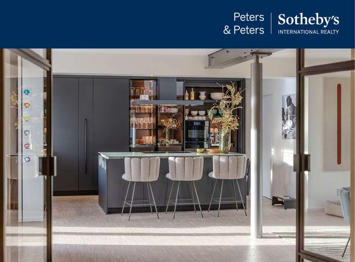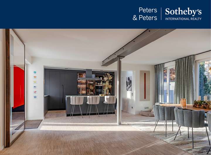 Der Ess- und Küchenbereich strahlt eine großzügige Offenheit aus und wird von beiden Seiten sanft mit Licht durchflutet. Die neuwertige Boffi-Designerküche besticht durch eine Bar und eine Kochinsel, während anthrazitfarbene Möbel Ruhe und eine ordentliche Bühne für Kochkunst bieten. Ergänzt wird dies durch einen deckenhohen Einbauschrank im Flur, eine Garderobe und ein elegantes Gäste-WC.