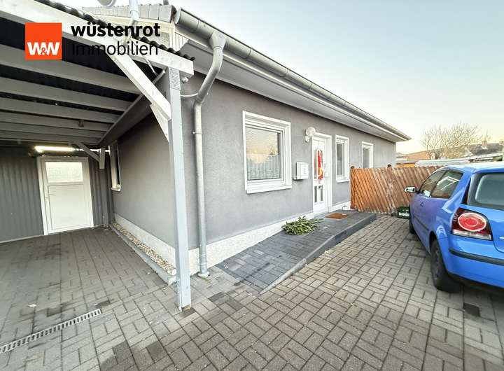 Der Carport grenzt direkt an das Haus. In den Garten gelangt man sowohl vom Carport aus als auch vom Hof. Direkt am Carport angrenzend befindet sich ein Fahrrad-/Geräteraum und im hinteren Hof-Gartenbereich noch eine Werkstatt.