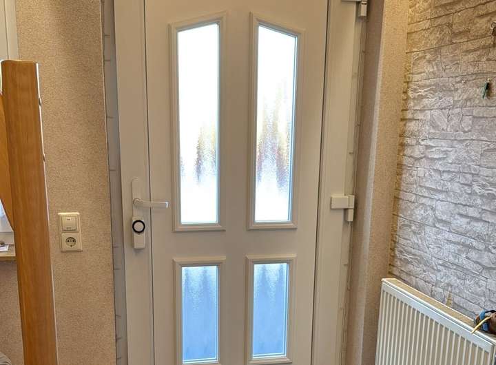 Die Türen und Zargen (Buche Röhrenspanstreifentüren) im EG sind weiß gestrichen. Die Räume im DG haben weiße Kunststofftüren.