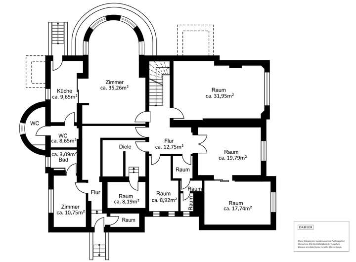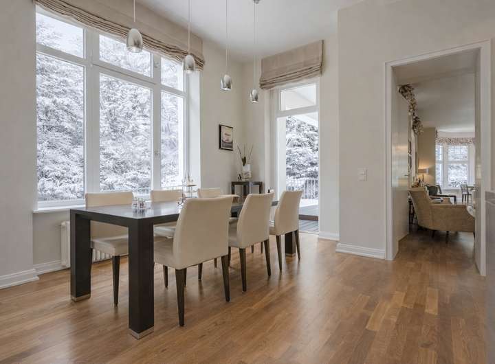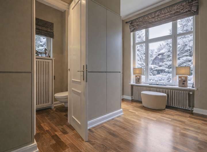 Das Hochparterre empfängt mit einem repräsentativen Entrée, Gäste-WC und Garderobe. Herzstück ist der offen gestaltete Ess- und Küchenbereich mit hochwertiger SieMatic-Einbauküche, der nahtlos in den eleganten Wohnbereich übergeht. Eine stilvoll integrierte Hausbar mit Lounge-Charakter sowie die lichtdurchflutete Essecke im Erker schaffen eine einladende Atmosphäre. Die Raumgestaltung ermöglicht flexible Nutzung auf hohem Wohnniveau.
