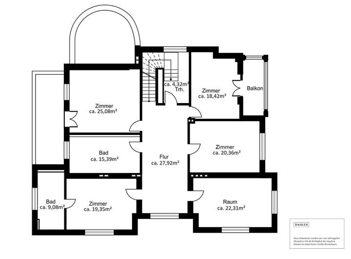 Ein heller Flur erschließt vier großzügige Zimmer, zwei davon mit Balkon. Ergänzt wird das Geschoss durch ein Ankleidezimmer sowie zwei Bäder – eines davon en suite.