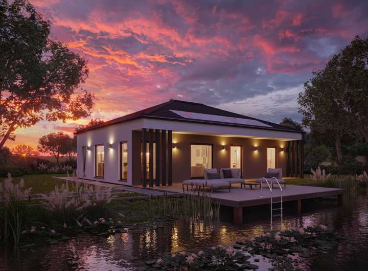 Unser barrierefreier Fertighaus-Bungalow vereint moderne Technik mit behaglicher Wohnatmosphäre: KfW 55 bis KfW 40 + QNG,