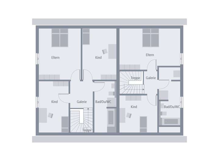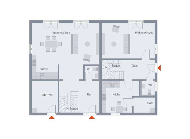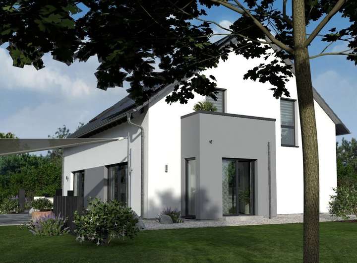 Erst auf den zweiten Blick erkennt man, dass unter dem Satteldach gleich zwei Häuser stecken. Mit unterschiedlichen Grundrissen und Größen entspricht die Planung nicht dem klassischen Doppelhaus. Während die eine Hälfte Raum für eine Familie mit bis zu zwei Kindern bietet, fühlen sich im etwas kleineren Haus Singles, Paare oder Familien mit nur einem Kind wohl. Ob Familienmitglieder mit einziehen oder fremdvermietet wird, entscheidet der Bauherr. Jedes Haus hat seinen eigenen Hauswirtschaftsraum. So wirtschaftet jeder autonom. Alle Räume überzeugen im typischen OKAL-Stil mit hohem Komfort, Großzügigkeit und viel Lichteinfall.