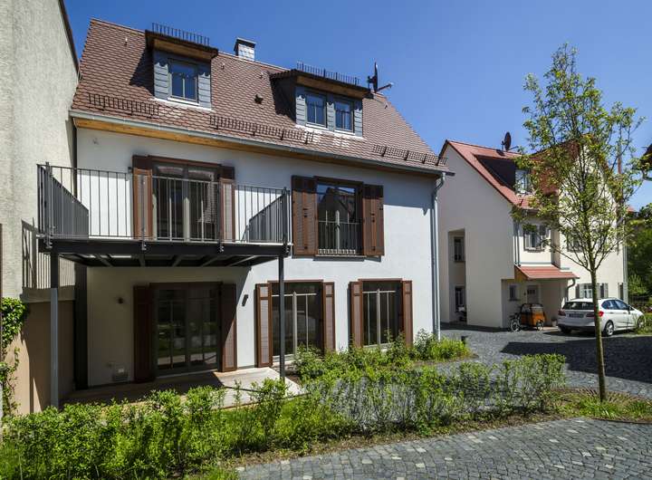 Dieses wunderschöne Einfamilienhaus ist sehr harmonisch in ein neu gestaltetes “Dorfambiente“ eingebettet. Es liegt in einer kleinen und sehr ruhigen Seitenstraße in zweiter Baureihe. Verkehrslärm und sonstige Lärmbelästigungen gibt es hier nicht. Die insgesamt 6 Einfamilienhäuser wirken auf den ersten Eindruck wie ältere Stadthäuser, sind jedoch allesamt neu und top-modern gebaut und gestaltet.
