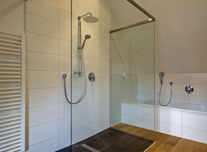 • 2 Tageslichtbäder / Haupt-Bad mit großer, bodentiefer Ganzglasdusche