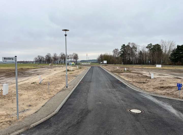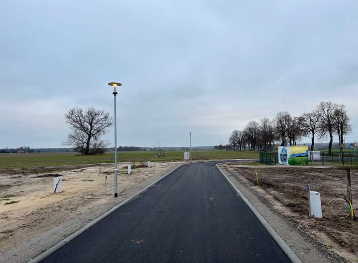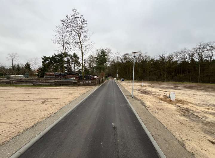 Zwischenzeitlich erfolgten die Arbeiten zur Erschließung. Das bedeutet alle Medien liegen an oder auf Ihrem Grundstück. Der komplette Straßenbau mit Beleuchtung und Grünplanung ist fertig gestellt.