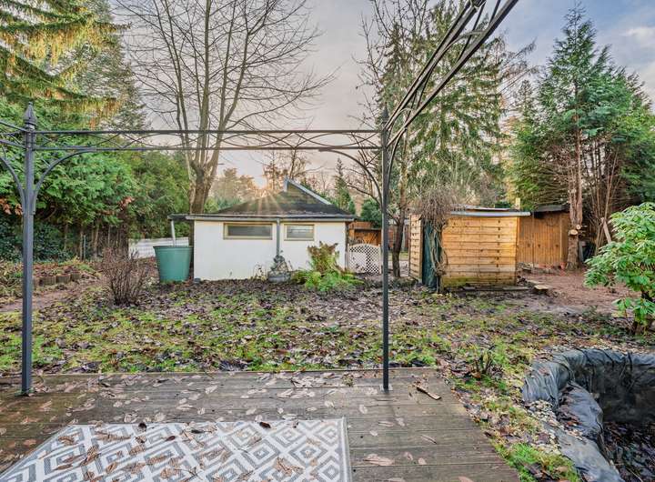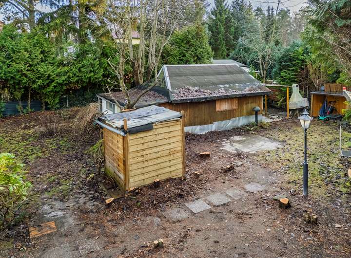 Die Zuwegung zum Grundstück erfolgt über ein im Grundbuch gesichertes Geh-, Fahr- und Leitungsrecht über das vordere Grundstück. Das Haus in der ersten Reihe hat eine davon getrennte Einfahrt. Aktuell ist das Grundstück mit zwei kleinen Bestandsgebäuden (Sommerbungalows in Holzständerweise) bebaut.