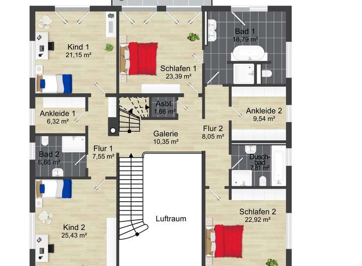 - 2 Kinderzimmer mit eigenem Tageslichtbad mit Dusche,