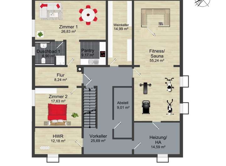 Im Untergeschoss erwartet Sie ein eleganter Gästebereich mit zwei Zimmern, Pantryküche und Duschbad. Neben Weinkeller, Hauswirtschaftsraum und großen Abstellflächen begeistert vor allem der exklusive Wellnessbereich mit Sauna und Fitnessraum – ein privater Spa-Bereich für Ruhe und Balance.
