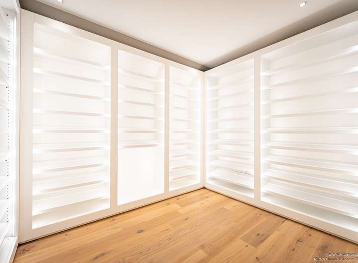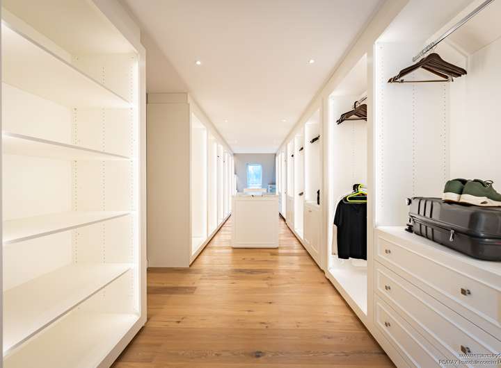 Über eine Galerie erreicht man vier elegant gestaltete Schlafzimmer, darunter zwei Kinderzimmer, sowie drei luxuriöse Badezimmer mit edlen Armaturen und feinsten Materialien. Zwei Ankleidezimmer und ein Abstellraum ergänzen diese Ebene und unterstreichen den hohen Komfortanspruch.