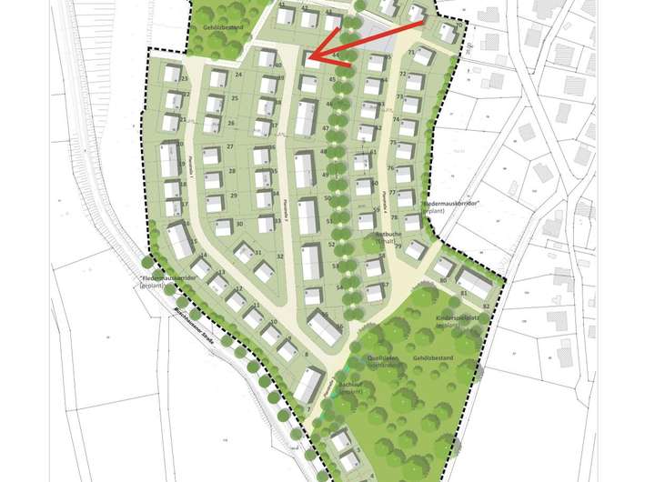 Das hier zum Verkauf angebotene Grundstück mit der Parzellennummer 44 umfasst 561 m² und liegt im westlichen Bereich des Neubaugebietes.
