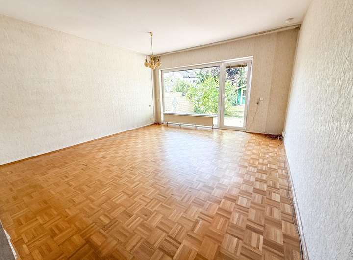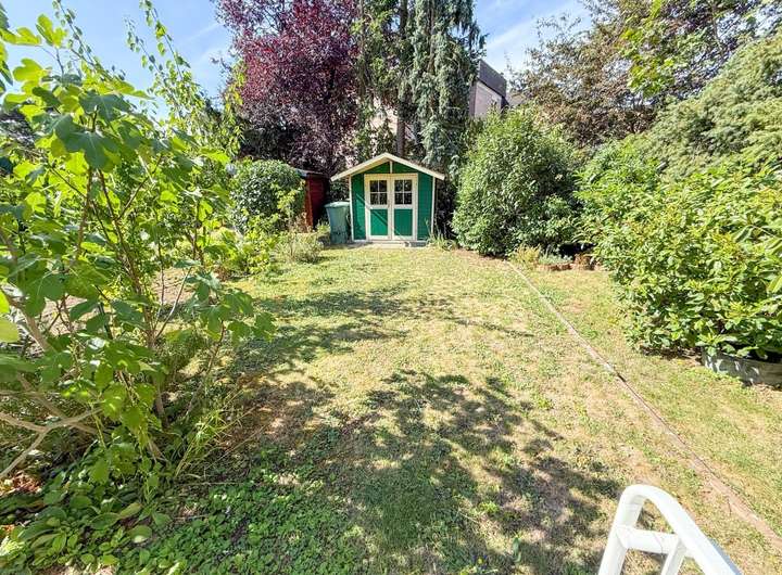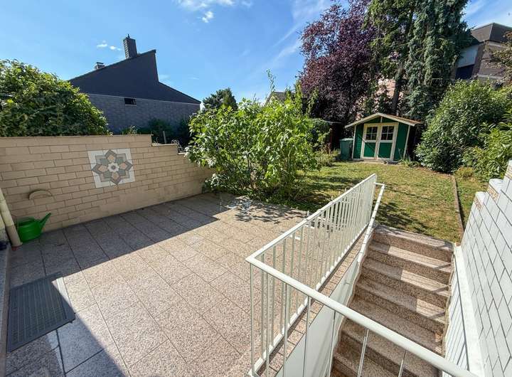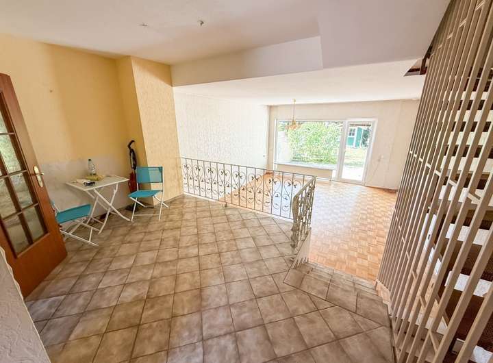 Auf der Ess-Ebene befindet sich auch die separate Küche mit Einbauküche. Über wenige Stufen gelangen Sie in den Wohnbereich mit direktem Zugang zur Terrasse und in den idyllischen Garten, der mit einem Gartenhaus und einem Feigenbaum zusätzliche Highlights bietet.