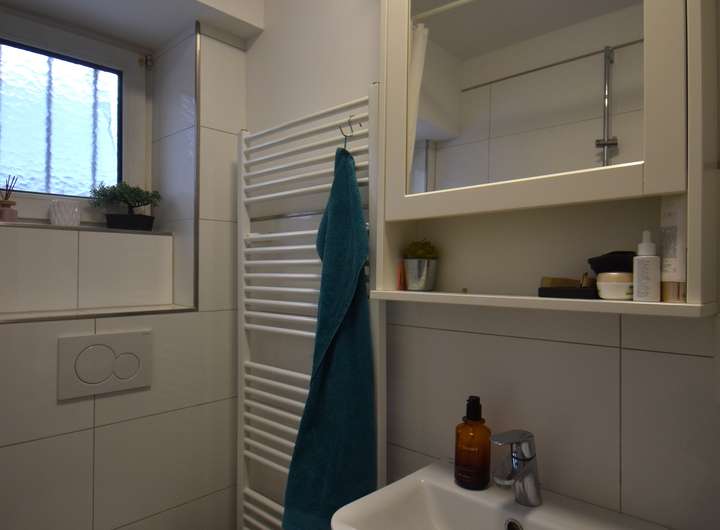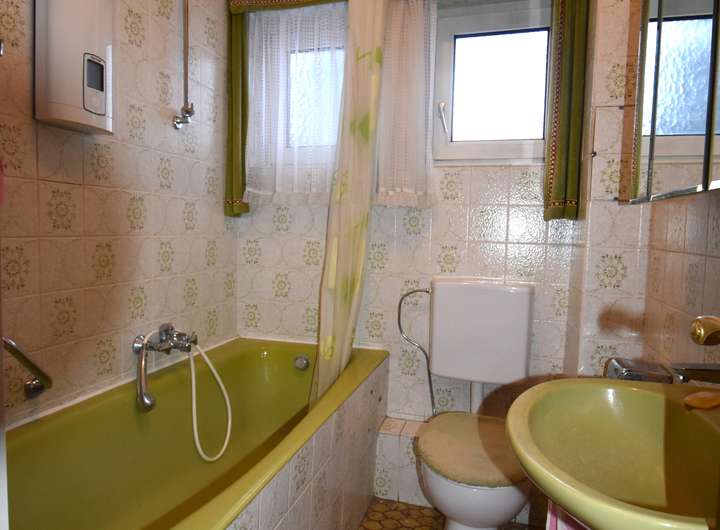 Fußbodenfliesen, Wandflächen sind türhoch gekachelt, Raufaser an den restlichen Wandflächen und an der Decke, Badewanne, Waschbecken, WC, Tageslichtfenster