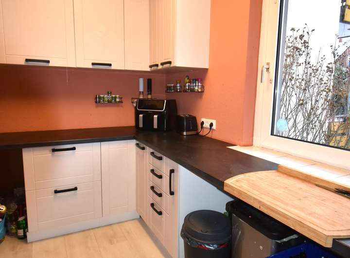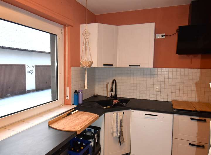 Laminatfußboden, Raufaser an den Wandflächen, Arbeitsbereich gekachelt, Raufaser an der Decke