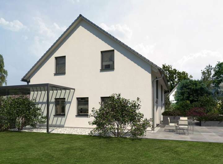 Klein, aber fein, so kommt unser Doppelhaus 07 daher. Unter dem eleganten Satteldach befinden sich zwei Wohneinheiten - und diese verteilen sich auf zwei Ebenen. Sie bieten ausreichend Raum und Komfort für Singles, Paare oder Kleinfamilien. Das Erdgeschoss prägt ein großzügig gestalteter Wohn-Ess-Bereich mit integrierter Küchenzeile. Aus der Küche hat man direkten Zugang zu einem großen und praktischen Hauswirtschaftsraum, der zahlreiche Lagermöglichkeiten bietet. Ein Gäste-WC und eine Garderobe befinden sich ebenfalls auf dieser Etage. Die halbgewendelte Treppe im Dielenbereich unterteilt das Erdgeschoss auf elegante Weise in Nutz- und Wohnbereich. Im Dachgeschoss stehen den künftigen Eigenheimbesitzern rund 50 m² Wohnfläche zur Verfügung - und die lassen dank ihrer durchdachten Raumaufteilung keine Wünsche offen. Das Elternschlafzimmer sowie das Kinderzimmer wirken durch die Dachschrägen besonders heimelig und bieten dennoch ausreichend Raum zum Stellen von Möbeln, zum Erholen, Entspannen und Spielen. Ebenfalls auf dieser Ebene: ein großes Tageslichtbad mit Wanne, Dusche und WC. Hier lautet die Devise: maximaler Wohnkomfort auf kleinem Raum.