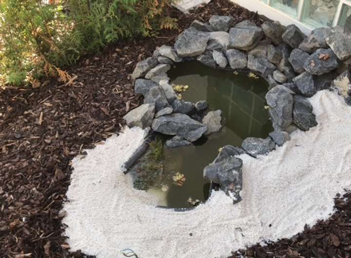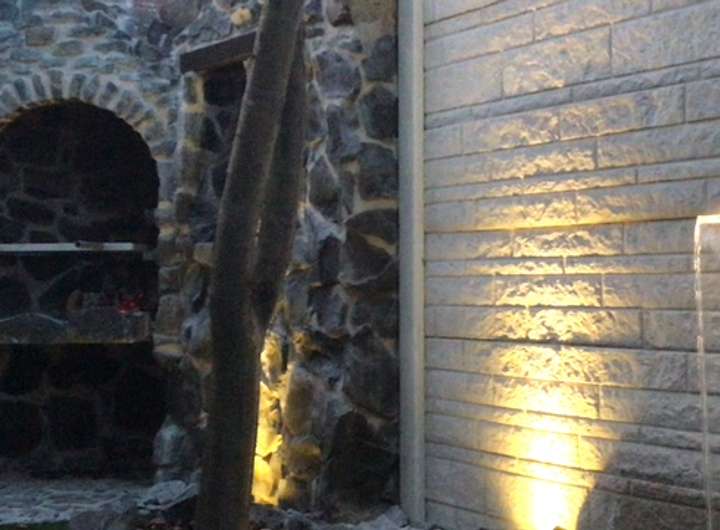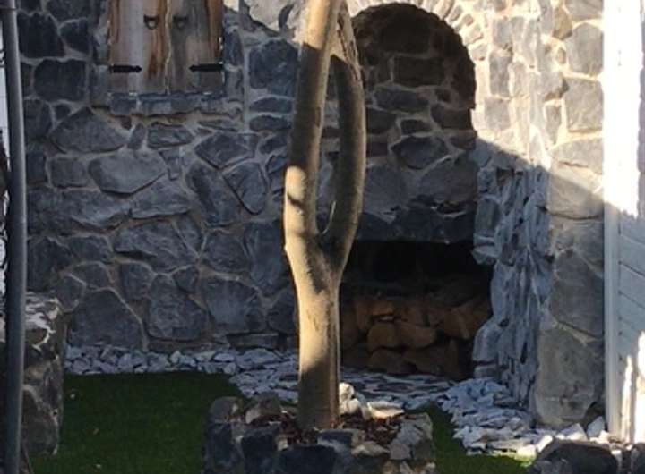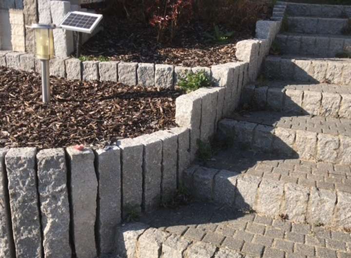 Aussen alles in "Metten Stein & Design" Granit mit Basalt, Gartenhaus, 2 Terrassen, Aussenkamin mit Grill und Wasserfall.