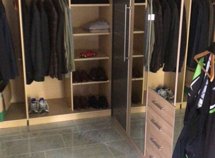 Vorraum zum Treppenhaus mit Fußbodenheizung, Granitboden, massivem Einbauschrank und 2 begehbaren Kleiderschränken.