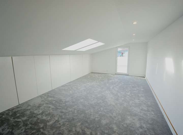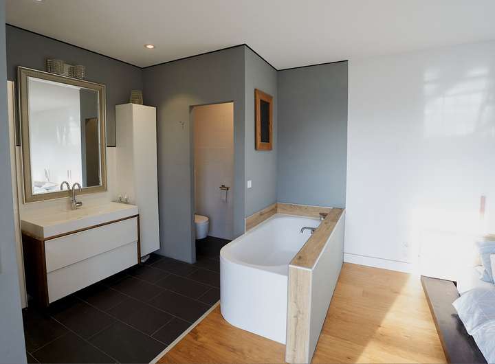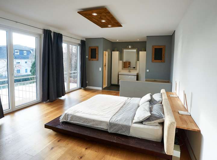 Das 24 m² Büro mit raumhohem, maßgefertigtem Einbauschrank und direktem Gartenzugang bietet ein ideales Homeoffice-Ambiente. Der luxuriöse Elternbereich (ca. 50 m²) verfügt über ein eigenes Bad en Suite und einen begehbaren Kleiderschrank. Drei zusätzliche Schlafzimmer und zwei Bäder schaffen großzügigen Raum für Familie oder Gäste.