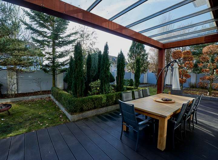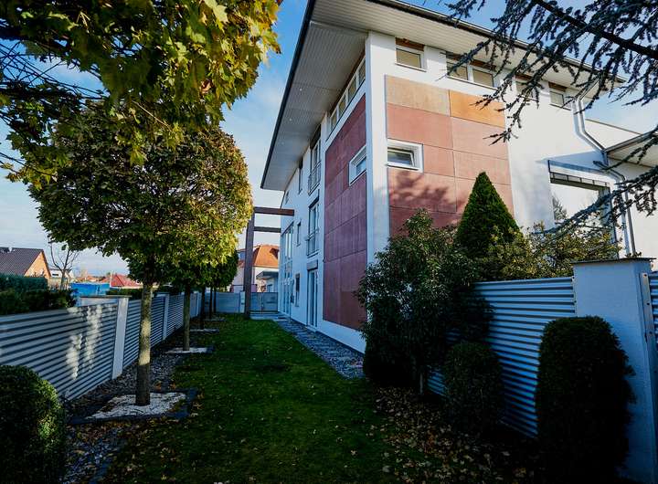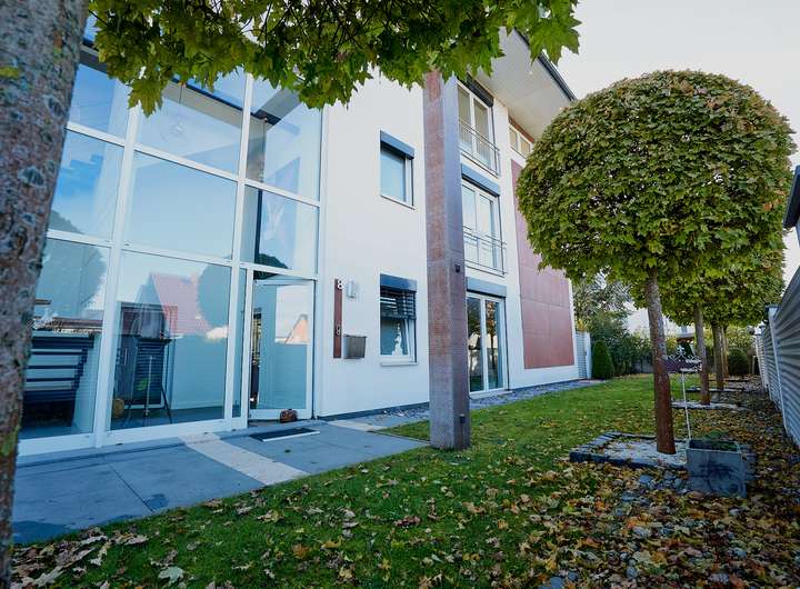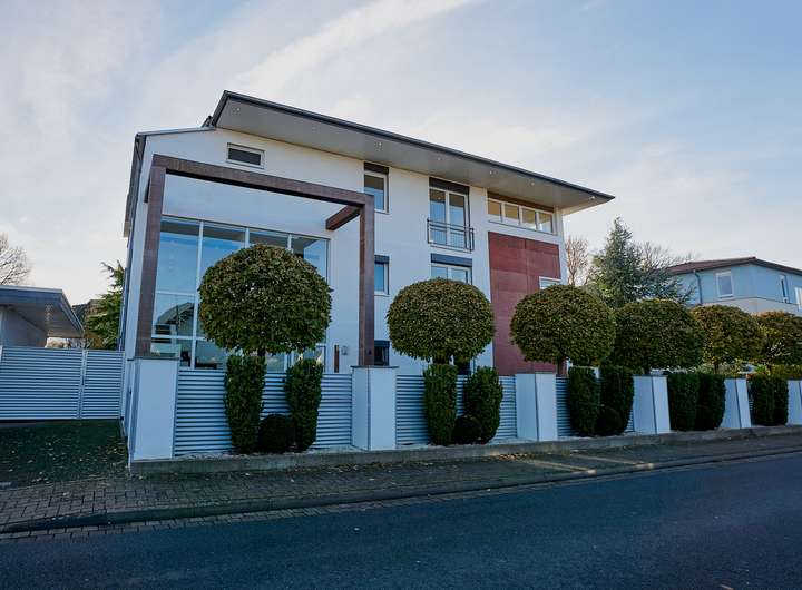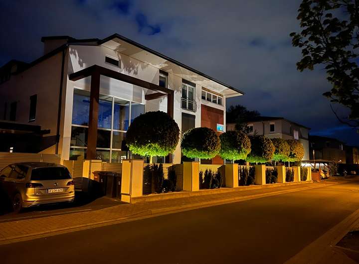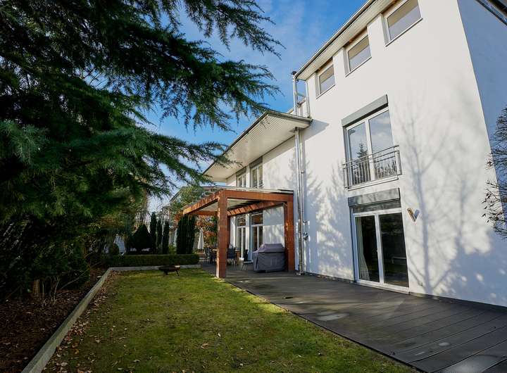 Die Immobilie überzeugt durch ihre hochwertige Gartengestaltung – pflegeleicht, blickdicht und mit altem Baumbestand. Eine automatische Bewässerungsanlage, Beleuchtung und die mit sechs Kugelahornbäumen in einer Reihe platzierten Linie, verleihen dem Anwesen besondere Eleganz.
