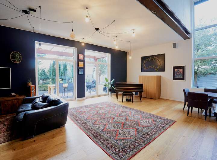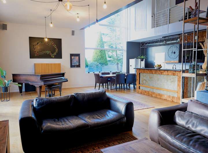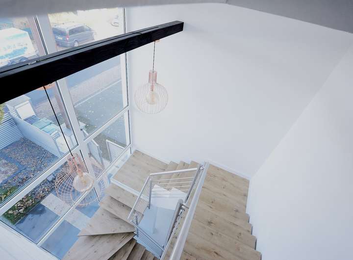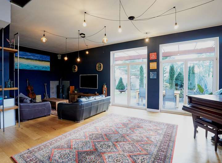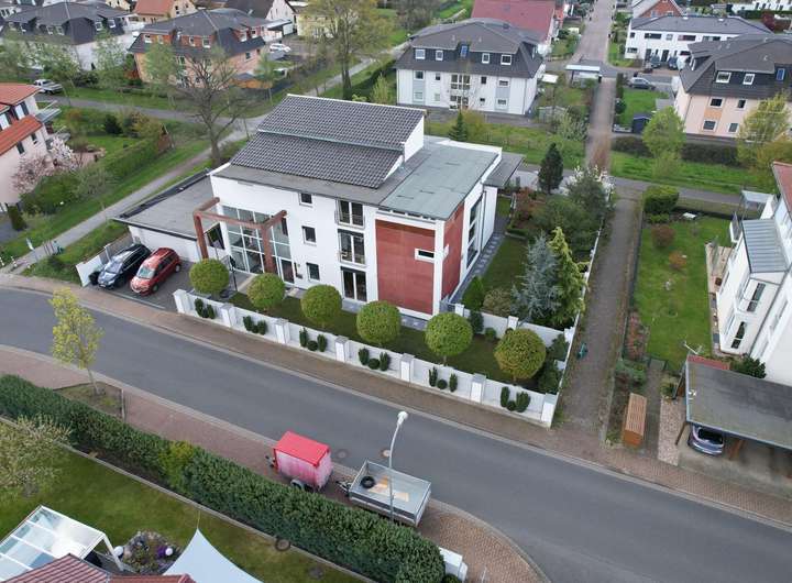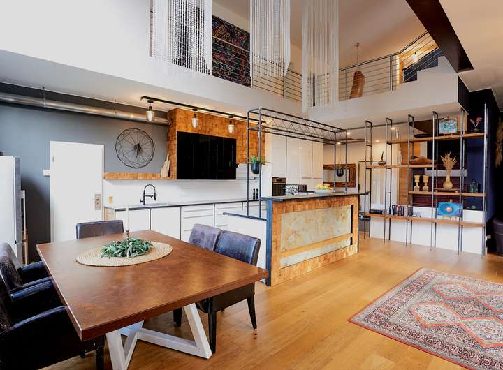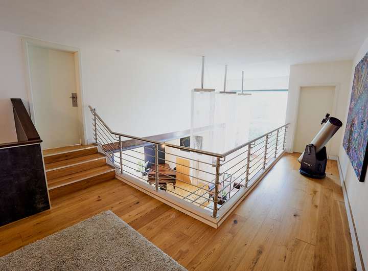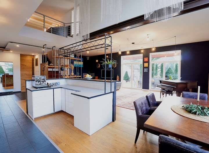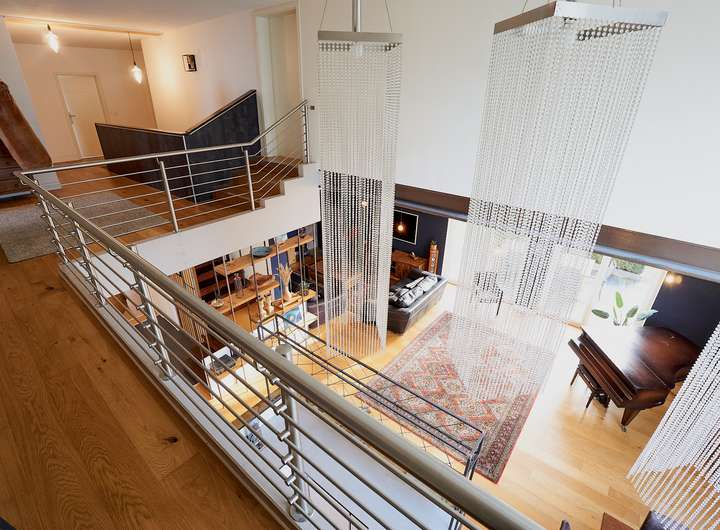 Die Villa beherbergt zwei Wohneinheiten – eine großzügige Hauptwohnung über zwei Etagen sowie eine separate Dachgeschosswohnung mit eigenem Eingang. Die Immobilie präsentiert sich mit Liebe zum Detail, handwerklicher Perfektion und hochwertigen Materialien. Der rund 100 m² große Wohn- und Essbereich bildet das Herz des Hauses: lichtdurchflutet, offen gestaltet und mit einer beeindruckenden Raumhöhe von bis zu 6 m in der Galerie. Eine elegante Café-Bar setzt gestalterische Akzente und macht den Raum zu einem echten Highlight.
