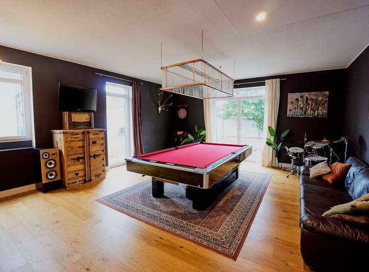 Für Erholung und Geselligkeit sorgen eine Bio-Sauna, das stilvolle 45 m² Herrenzimmer mit Billardtisch, Bar und Dart sowie die teils überdachte Terrasse mit über 60 m² Fläche – ideal für sommerliche Gartenfeste.