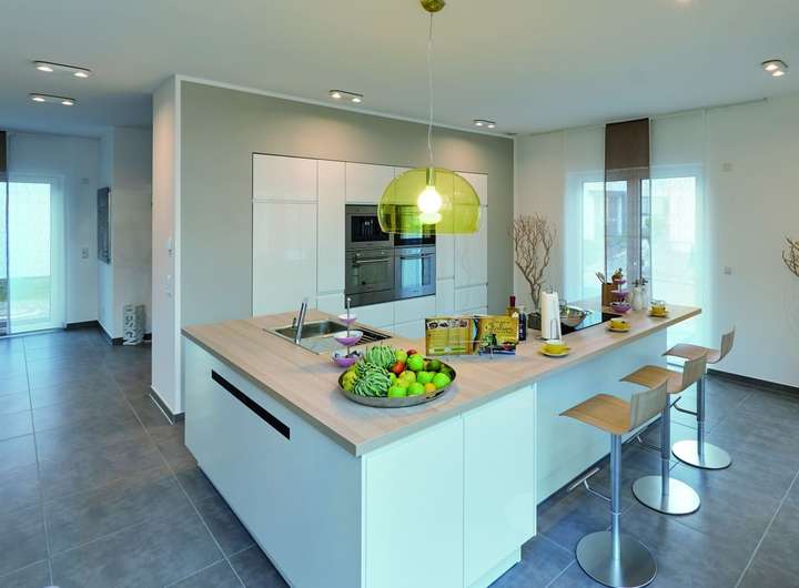 Der offene Wohn- und Essbereich ist das Highlight des Hauses. Hier wird gelebt, gespielt, gegessen und gelacht. Von der offenen Küche hat man stets einen guten Überblick über den Wohn- und Essbereich. Auch der an der Küche angrenzende Hauswirtschaftsraum bietet genug Platz für allerlei Gerätschaften oder kann in eine großzügige Speisekammer verwandelt werden.