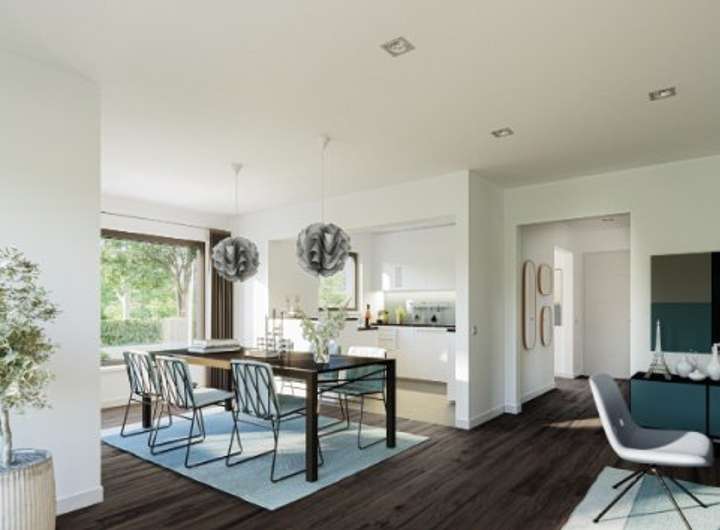 Der wohldurchdachte Grundriss weist die offene Küche und den Essplatz als weitere eigene Zone aus. Und egal ob der
