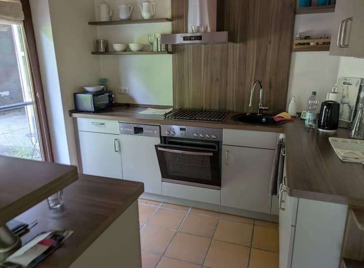Vaillant Gas-Heizung, Kamin im Wohnzimmer, Größtenteils doppelt verglaste Isolierfenster, Einbauküche mit Cerankochfeld.