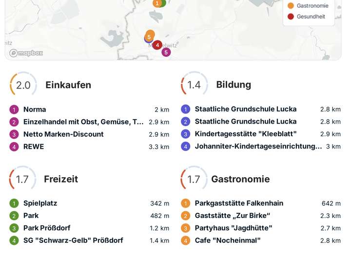 Die Autobahn ist nur etwa 15 Kilometer entfernt und bietet somit eine schnelle Verbindung zu den umliegenden Städten und Regionen. Innerhalb von 40min. erreicht man Leipzig. Für Familien ist die Nähe zu Bildungseinrichtungen besonders vorteilhaft: Ein Kindergarten und eine Grundschule sind in weniger als drei Kilometern erreichbar, während ein Gymnasium ebenfalls nur knapp vier Kilometer entfernt liegt. Diese kurzen Distanzen gewährleisten einen schnellen und unkomplizierten Zugang zu allen Bildungsangeboten der Region.