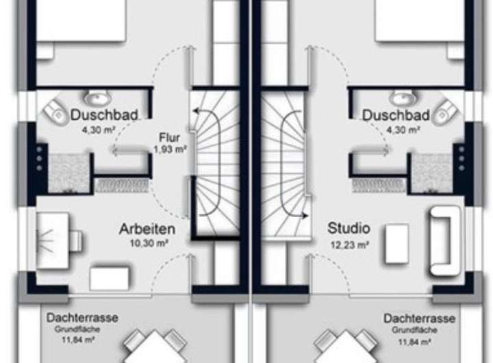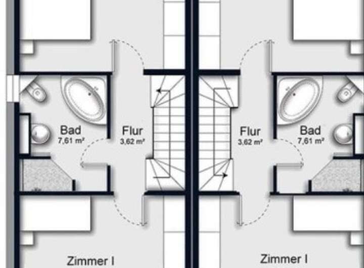 Im Dachgeschoss befinden sich 2 weitere Schlafzimmer und ein Duschbad (wahlweise möglich gegen Aufpreis).