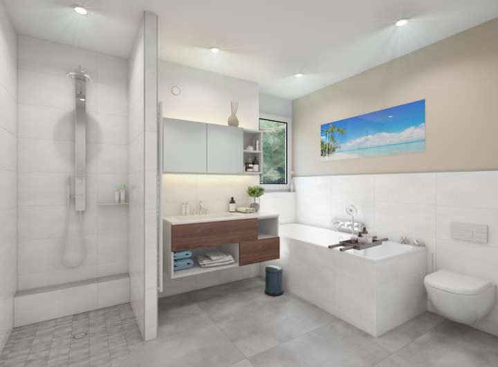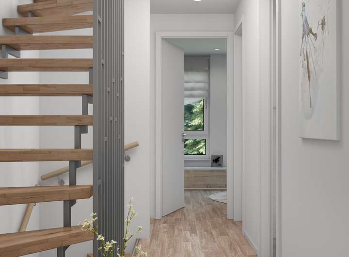 Unsere Häuser bieten auf einer Wohn- und Nutzfläche von bis zu 160m² die Möglichkeit vielen Grundrissvarianten den passenden Raum für die Familie auszuwählen. Im Erdgeschoss befindet sich die Küche, das Wohn- und Esszimmer und ein Gäste-WC. Ein Arbeitszimmer könnte auf Wunsch problemlos integriert werden, ohne dabei an Raumqualität zu verlieren. Vom Wohnzimmer aus geht es in den eigenen Garten.