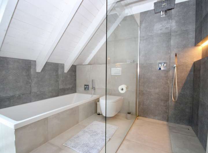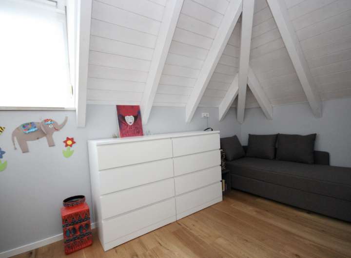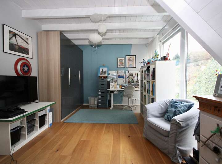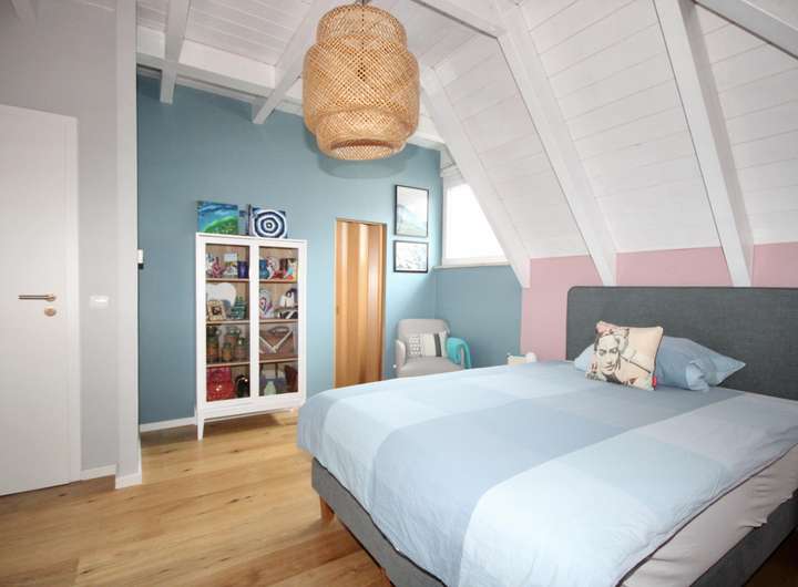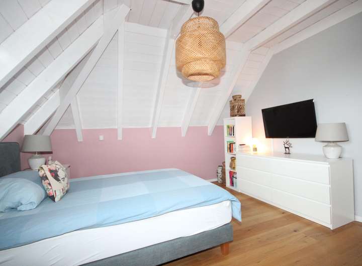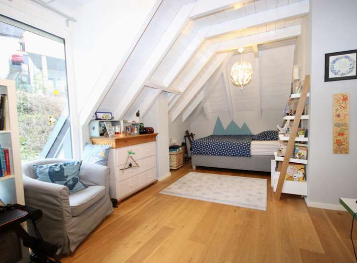 Im Dachgeschoss finden Sie drei geräumige Schlafzimmer. Das Elternschlafzimmer bietet einen kleinen separaten Bereich für Kleidung und zur Verstauung. Die anderen beiden Räume sind ideal als Kinderzimmer nutzbar. Ein modernes Vollbad komplettiert diese Etage und bietet ausreichend Platz und Privatsphäre für die Familie.