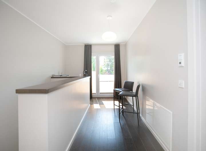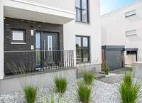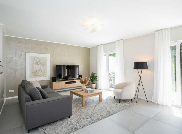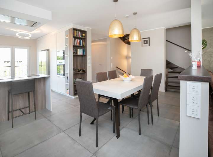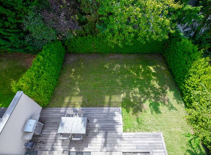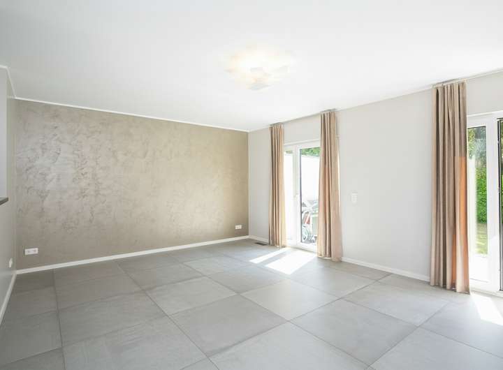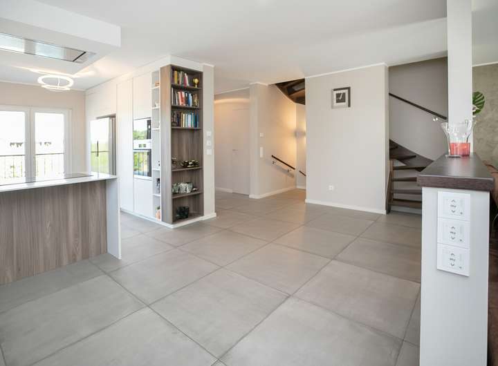 Das Erdgeschoss verfügt über einen offenen Wohn- und Essbereich mit integrierter Einbauküche. Der leicht separierte Wohnbereich bietet direkten Zugang zur sonnigen Terrasse und zum nach Süden ausgerichteten Garten. Im Obergeschoss stehen drei flexibel nutzbare Zimmer sowie ein stilvolles Tageslichtbad mit Badewanne und Dusche zur Verfügung. Hochwertiger Parkettboden sorgt in allen Wohnräumen für eine warme Atmosphäre.