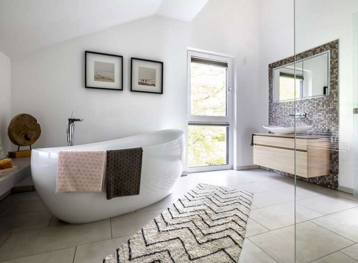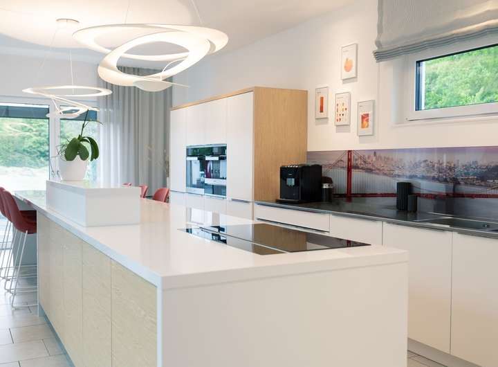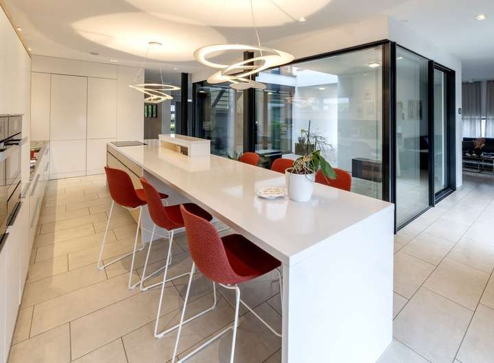 Ausgezeichnet mit dem German Design Award, steht das "Musterhaus Bad Vilbel" für inspirierende Architektur, optimale Grundstücksnutzung und ein Höchstmaß an Energieeffizienz. An das großzügige Hauptgebäude mit Satteldach schließt sich im Erdgeschoss der kubistische Anbau an und bietet vielfältige Nutzungsmöglichkeiten. Durch die Teilung der Dachflächen entsteht das Herzstück des Hauses: das Atrium, in Anlehnung an die römische Architektur. Bodentiefe Fenster und Schiebetüren verbinden Drinnen mit Draußen und sorgen für reichlich Lichteinfall. Hier trifft man sich!