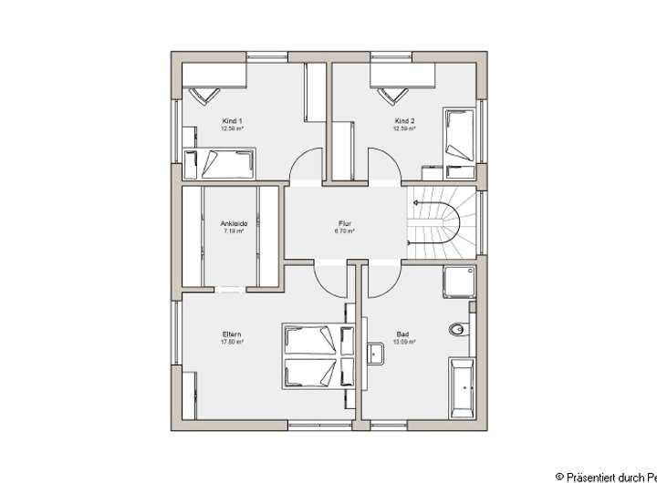 Eine u-förmige Treppe führt ins Dachgeschoss, welches über drei Schlafzimmer, eine Ankleide und ein großes Familienbad verfügt. Erreichbar sind alle Räume über den Flur. Zu dem Elternschlafzimmer zählt eine ganz persönliche Ankleide.