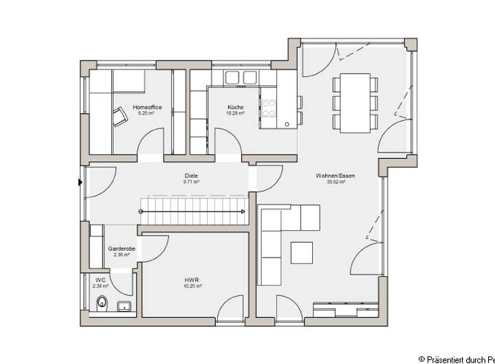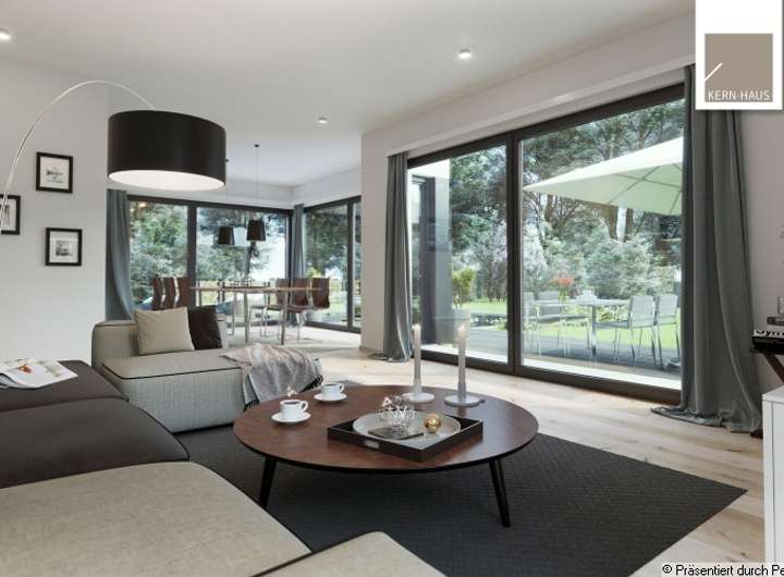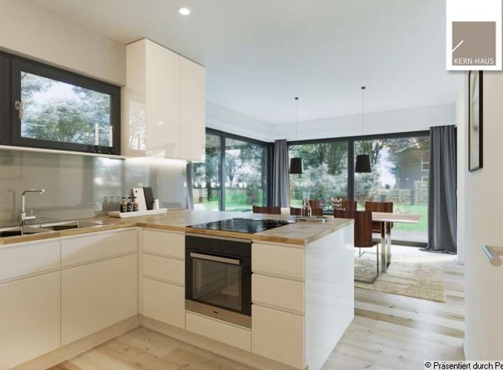 Wenn Sie die Diele des Architektenhauses Allea betreten, haben Sie Blick in den großen Wohn- und Essbereich. Durch bodentiefe Schiebeelemente ist dieser Bereich lichtdurchflutet und Sie können sowohl vom Sofa als auch vom Esstisch in den Garten schauen. Architektonisches Highlight des Familienhauses ist der Erker mit drei Fensterelementen, in dem das Esszimmer untergebracht ist. Die offene Küche grenzt direkt an das Esszimmer, ist aber auch von der Diele aus betretbar. Insgesamt umfassen Küche und Wohn-Essbereich mehr als 46 Quadratmeter. Im Erdgeschoss befinden sich zudem ein Home-Office, eine Garderobe sowie ein WC.