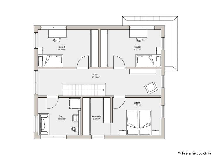 Über eine geradläufige Treppe erreichen Sie das Dachgeschoss. Gemütlich ist die Leseecke, in der Sie mit einem schönen Buch sitzen und durch das bodentiefe Glaselement nach draußen in den Garten schauen können. Der Flur wird durch zwei bodentiefe Fensterelemente auf beiden Seiten des Hauses lichtdurchflutet. Vom Flur aus haben Sie Zugang in die Zimmer des Dachgeschosses. Die beiden Kinderzimmer sind mit rund 14 Quadratmetern gleich groß. Das Elternschlafzimmer verfügt über eine eigene Ankleide. Das Familienbadezimmer besitzt neben einer Dusche auch eine Badewanne und ist rund zehn Quadratmeter groß. Hingucker auf der Eingangsseite ist das große Fensterelement über der Tür, das den Flur im Dachgeschoss lichtdurchflutet.
