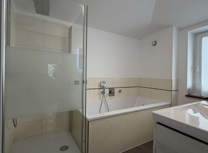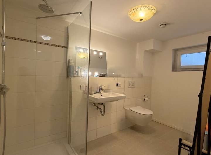 Der vollwertige Vollkeller mit weißer Wanne, Fußbodenheizung und Duschbad eröffnet vielfältige Nutzungsmöglichkeiten – perfekt als Gäste-, Arbeits-, Hobby- oder Wellnessbereich und ein echtes Plus an Fläche und Komfort. Sie kommen somit auf 220 m² Gesamtfläche.
