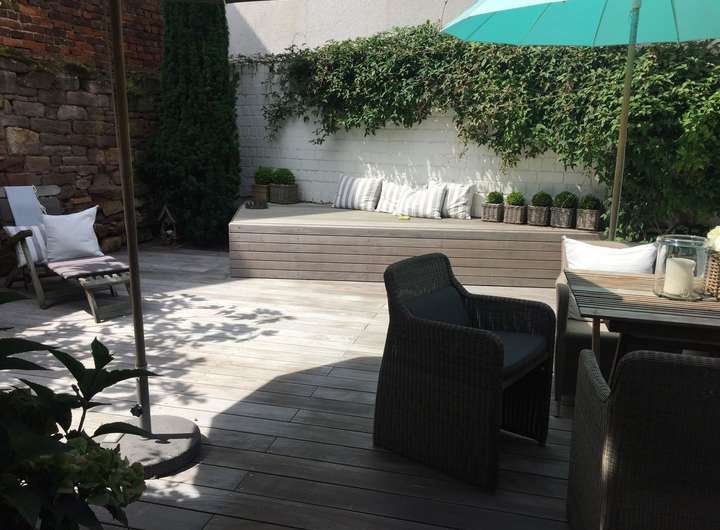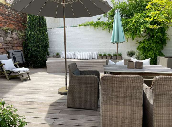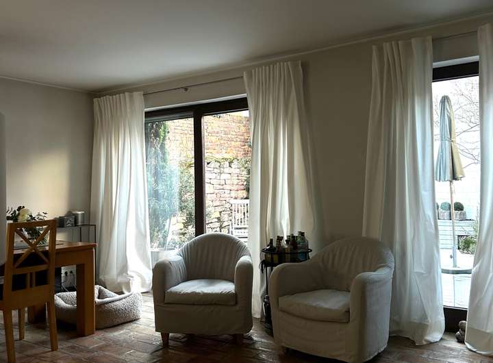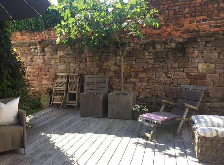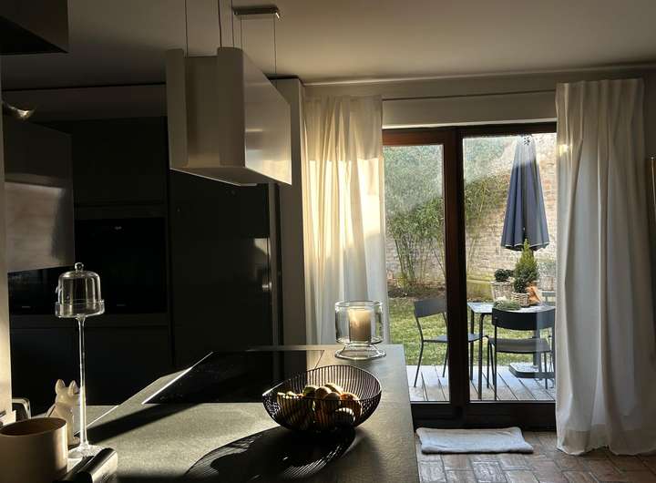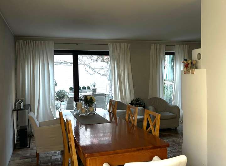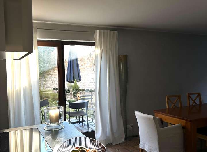 Im Erdgeschoss prägt ein rund 250 Jahre alter Cotto-Boden den offenen Wohn- und Essbereich. Die hochwertige, neuwertige Küche (Miele) ist harmonisch integriert. Kamin und Fußbodenheizung sorgen für Behaglichkeit. Raumhohe Glasschiebetüren führen auf eine großzügige IPE-Hartholzterrasse sowie eine zusätzliche seitliche Terrasse. Der professionell gepflegte Garten mit Rhododendron, Glyzinie und Magnolie ist an zwei Seiten von einer ca. 3 m hohen, von Efeu bewachsenen Sandstein- und Ziegelmauer eingefasst und bietet eine außergewöhnlich ruhige und private Atmosphäre mitten im Ortskern.