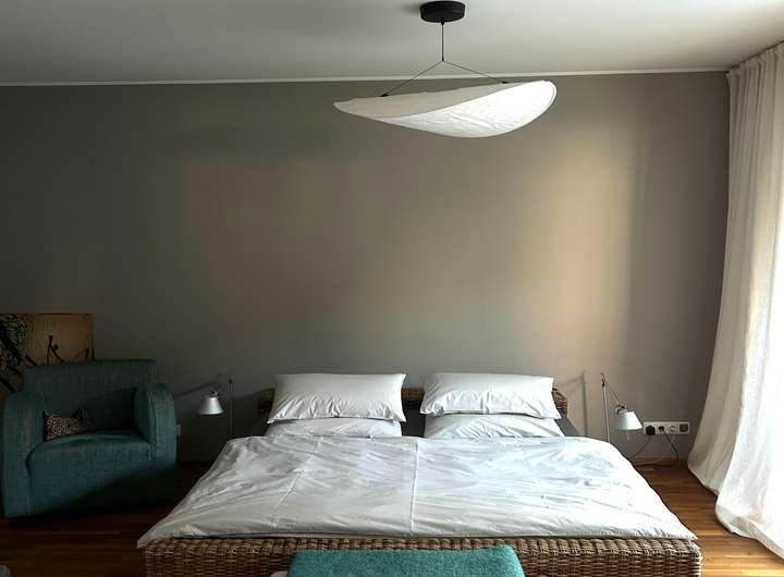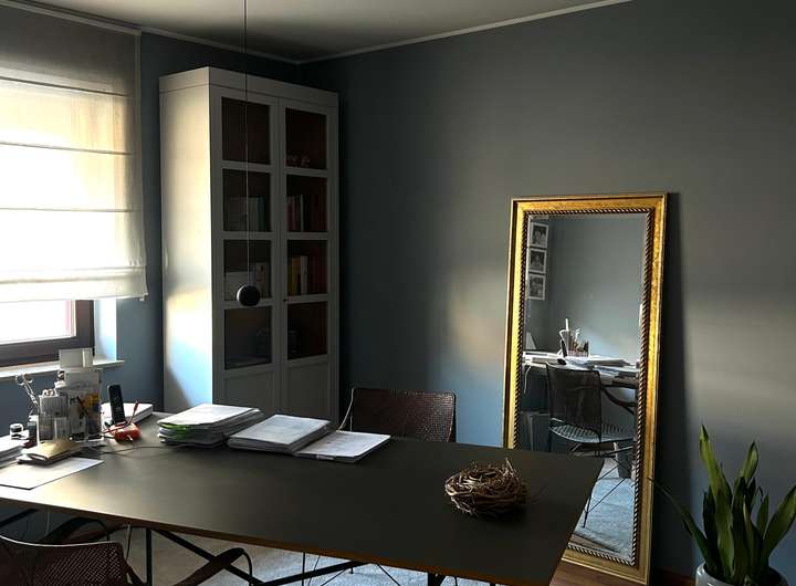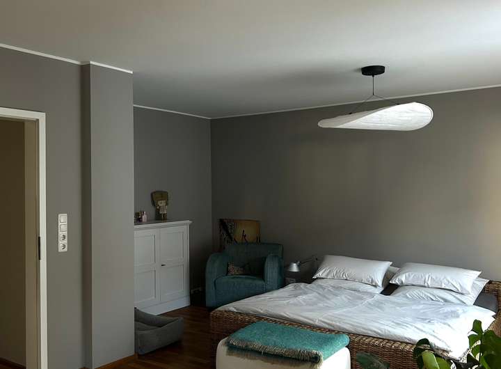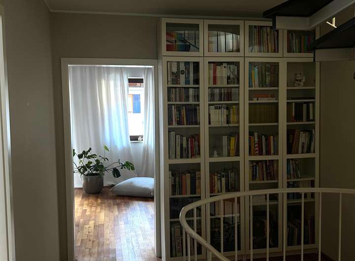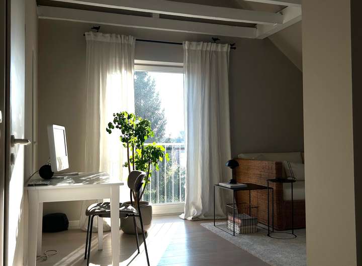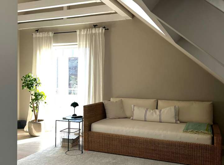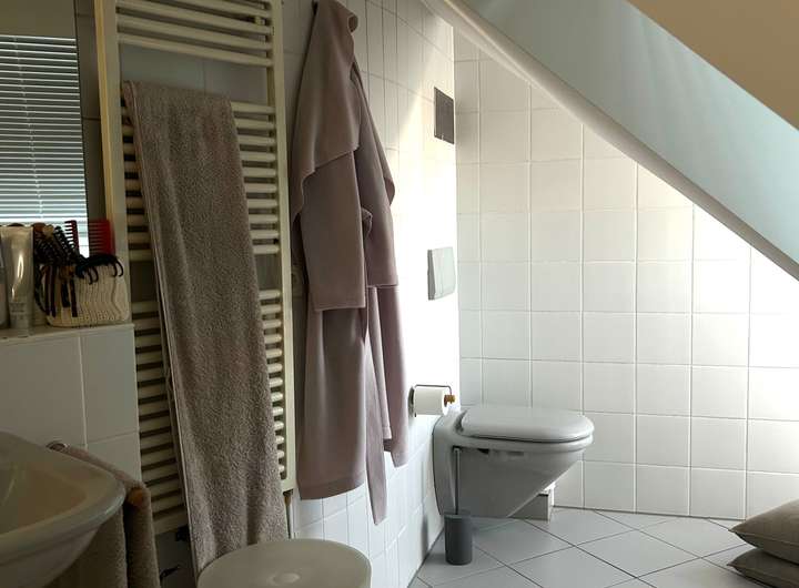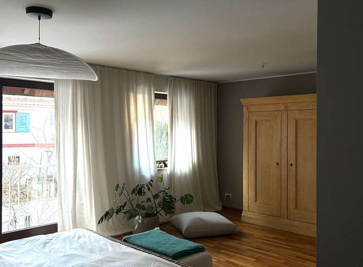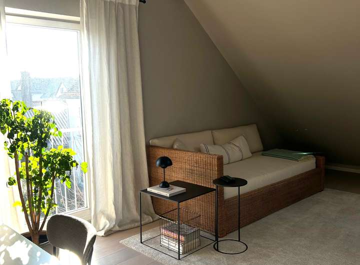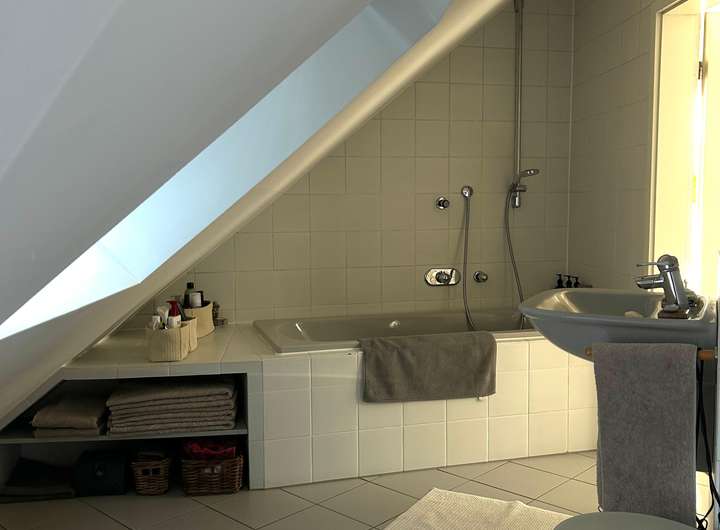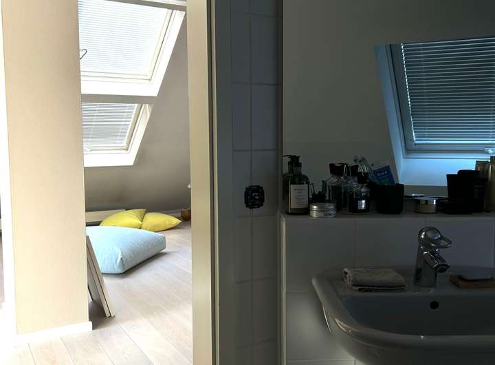 Im 1. Obergeschoss befinden sich zwei helle Zimmer mit Akazien-Echtholzparkett (teilbar in drei Räume) sowie ein Tageslichtbad mit Dusche. Das Dachgeschoss bietet ein offenes Studio mit Eiche-Parkett, sichtbarem Dachgebälk, Tageslichtbad mit Badewanne und einem separaten kleinen Büro. Mehrere Dachflächen- und bodentiefe Fenster sorgen für viel Tageslicht.