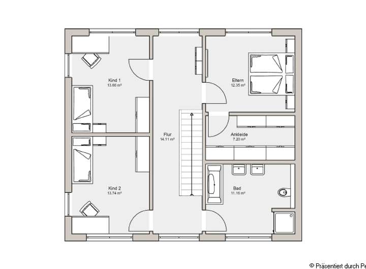 Im Obergeschoss steht das Wohlbefinden jedes einzelnen Familienmitglieds im Vordergrund. Die Räume der Kinder sind großzügig gestaltet und sind ein angenehmer Rückzugsort. Das Elternschlafzimmer verfügt über ein angrenzendes Ankleidezimmer. Im Wellness-Bad kann die ganze Familie nach Herzenslust die Seele baumeln lassen.