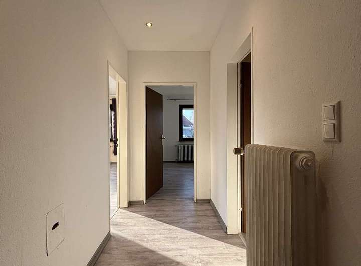 Das Obergeschoss mit ca. 61 m² Wohnfläche bietet viel Potenzial für individuelle Modernisierungs- und Gestaltungsideen. Hier befinden sich ein lichtdurchflutetes Wohnzimmer, eine helle Küche, ein Schlafzimmer, ein Flur und ein Tageslichtbad. Auch diese Einheit steht leer und wartet darauf, nach Ihren Vorstellungen gestaltet zu werden.