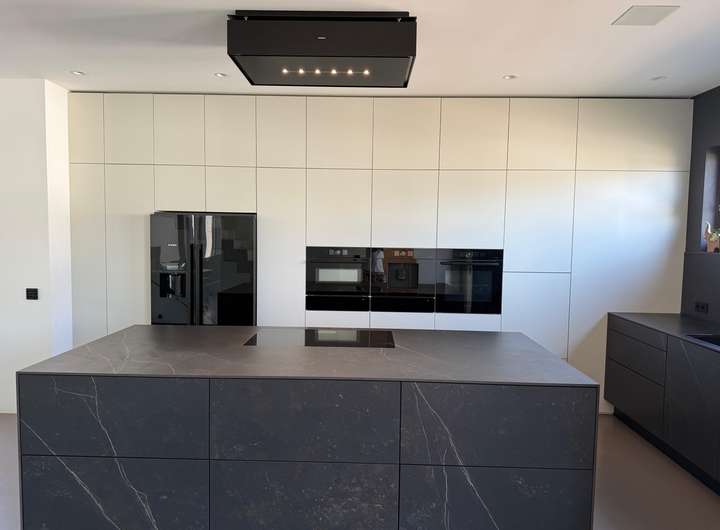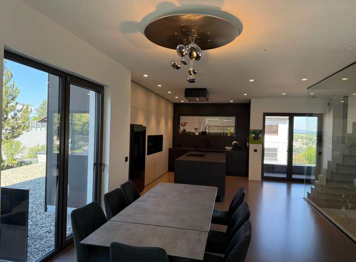 Ein über 80 m² großer, offen inszenierter Wohn- und Essbereich, gekrönt von einer monumentalen, 5 Meter hohen Glasfront (elektrisch betrieben Hebe-Schiebetür mit komfortabler Soft-Motion-Technologie)