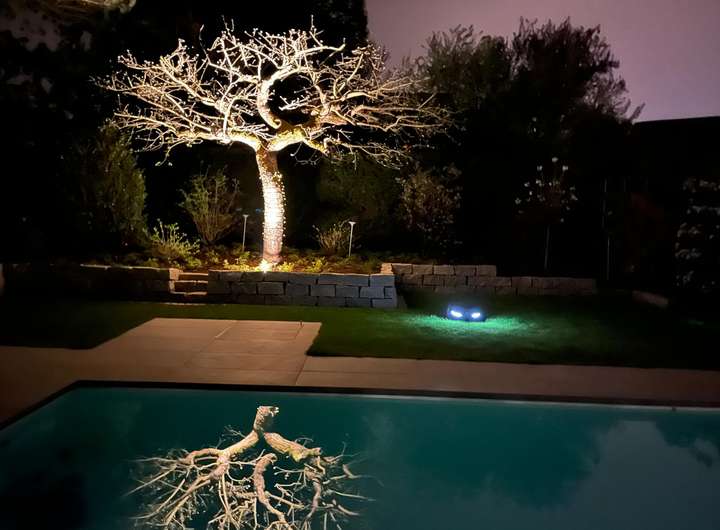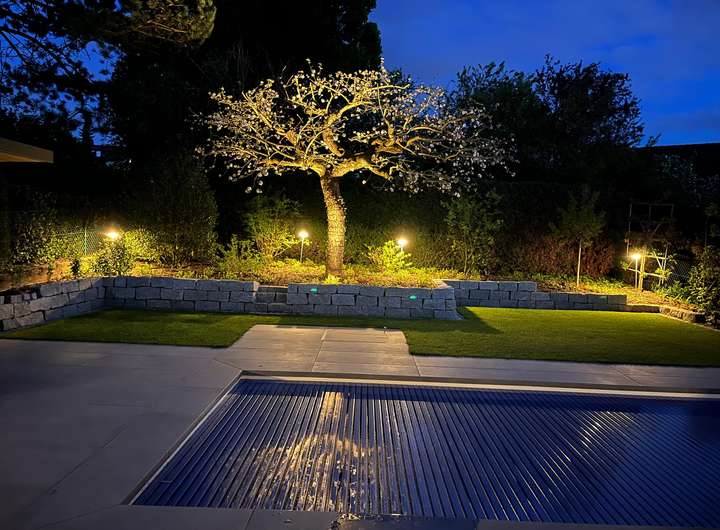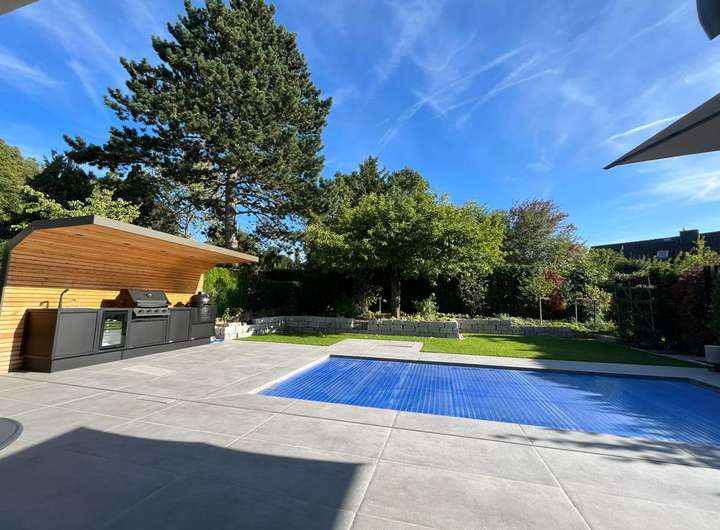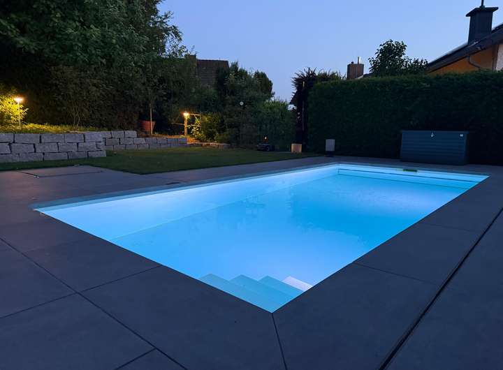 → Beheizter Pool mit dezenter Premium Abdeckung und Gegenstromanlage