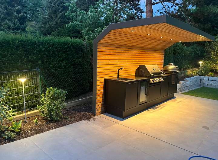 - Luxus Outdoorküche mit BBQ (Gas und Kohle / Keramik Grills), Spüle, Getränkekühlschrank usw.